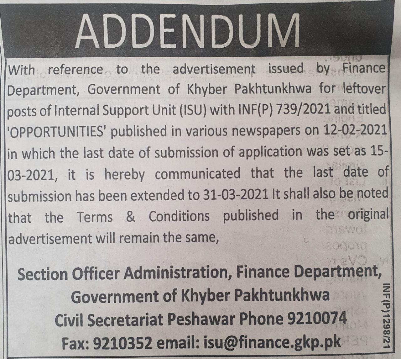 Applications are invited for the Internal Support Unit (ISU) in the Office of Minister for Finance, Government of Khyber Pakhtunkhwa